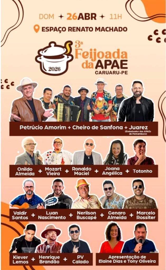 A Associação de Pais e Amigos dos Excepcionais (Apae Caruaru) realiza, neste domingo (26), uma feijoada beneficente, a partir das 11h, no Espaço Renato Machado, localizado na PE-95, bairro Universitário, em Caruaru. O objetivo do evento é arrecadar recursos para ajudar a instituição a atender pessoas com deficiência.