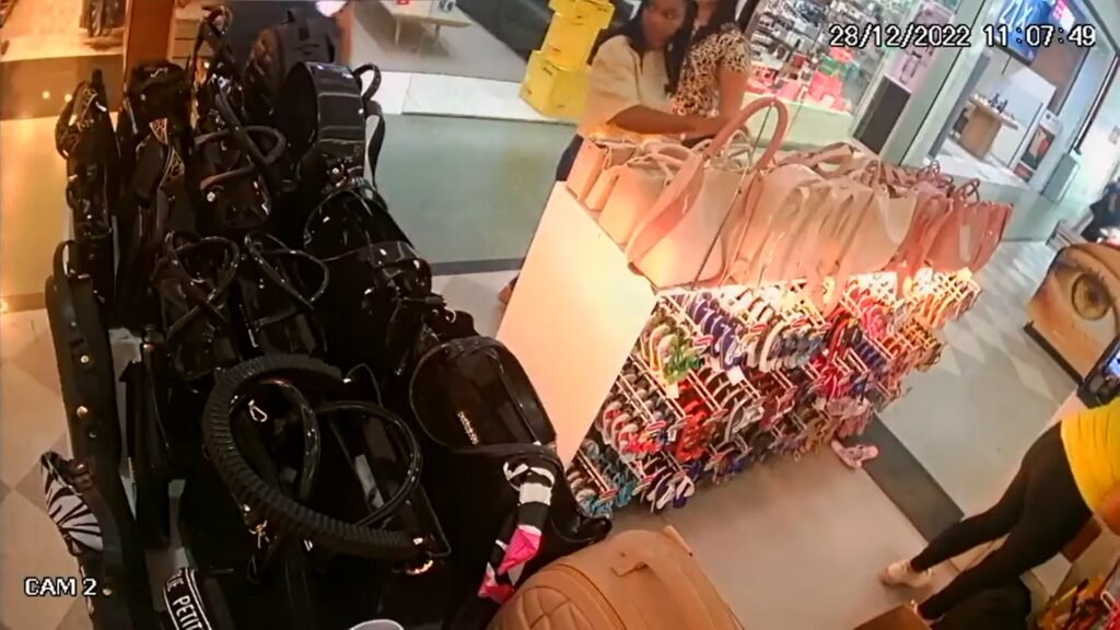 No vídeo, é possível ver que as duas se aproximam de uma das prateleiras de produtos da loja. Uma delas pela a bolsa e entrega a outra, que deixa o estabelecimento de forma discreta carregando o item na mão.