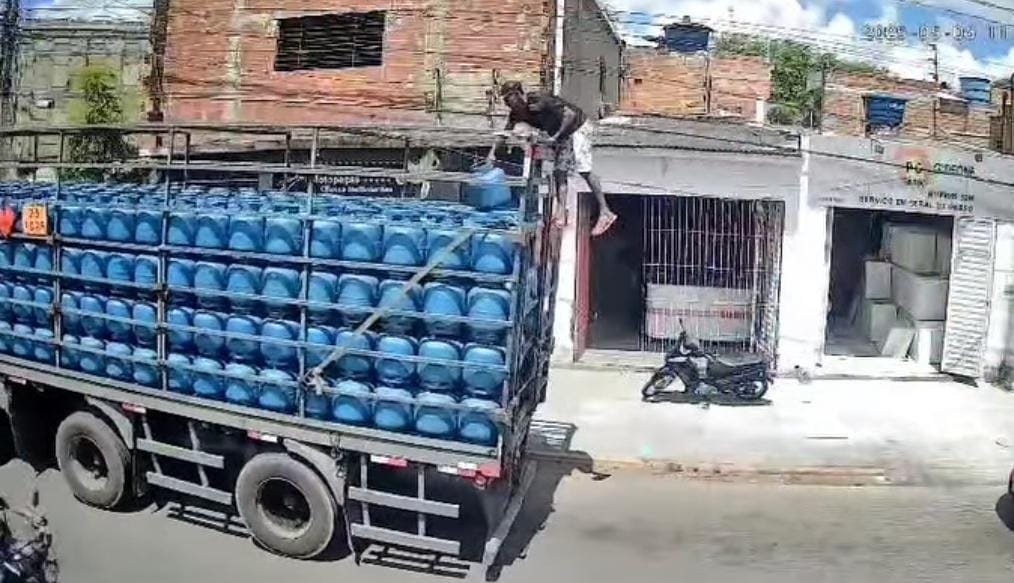Câmeras de segurança flagraram o momento exato em que um indivíduo, ainda não identificado, pulou em um caminhão que transportava uma carga de botijões de gás de cozinha – Gás Liquefeito de Petróleo (GLP). O homem furtou um botijão e pulou do veículo ainda em movimento.