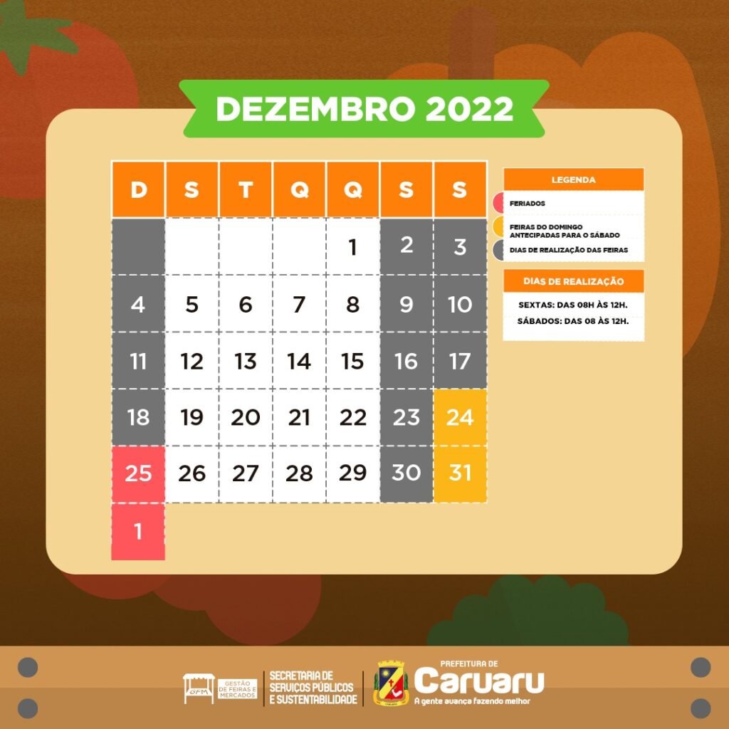 A Secretaria de Serviços Públicos e Sustentabilidade (Sesp), por meio da Gerência de Feiras e Mercados, informa as mudanças nos dias de realizações de algumas feiras de bairros e distritos, devido às comemorações do Natal e do Réveillon. Elas terão os seus funcionamentos antecipados, respectivamente, de 25 para 24, e de 1º de janeiro para 31 de dezembro.