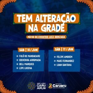Em Caruaru os shows dos cantores Lipe Lucena e Felipe Amorim, no Pátio de Eventos Luiz “Lua” Gonzaga, durante o São João de Caruaru tiveram alteração nas datas. A informação foi divulgada pela Fundação de Cultura do município, nesta quarta-feira (24).