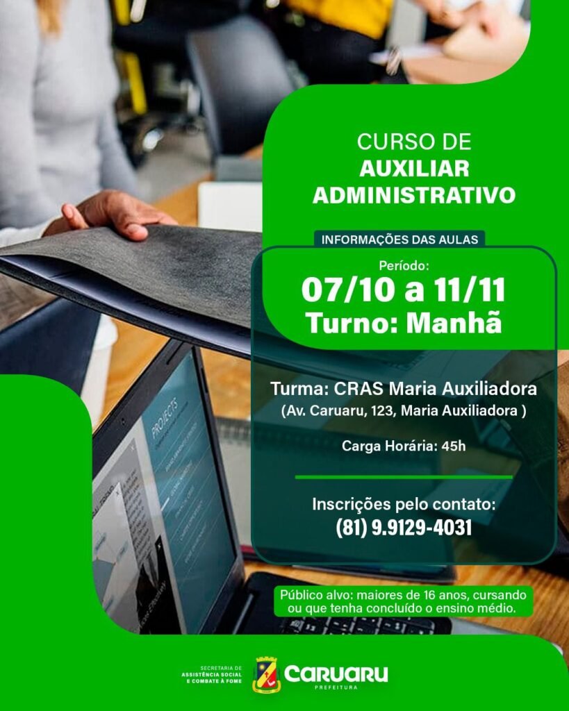 A Prefeitura de Caruaru anunciou a abertura das inscrições para o curso gratuito de Auxiliar Administrativo, ofertado pelo Programa Profissionaliza Mais. A iniciativa é realizada pela Secretaria de Desenvolvimento Econômico, Turismo, Tecnologia e Economia Criativa (SEDETEC), em parceria com a Secretaria de Assistência Social e Combate à Fome (SAS).