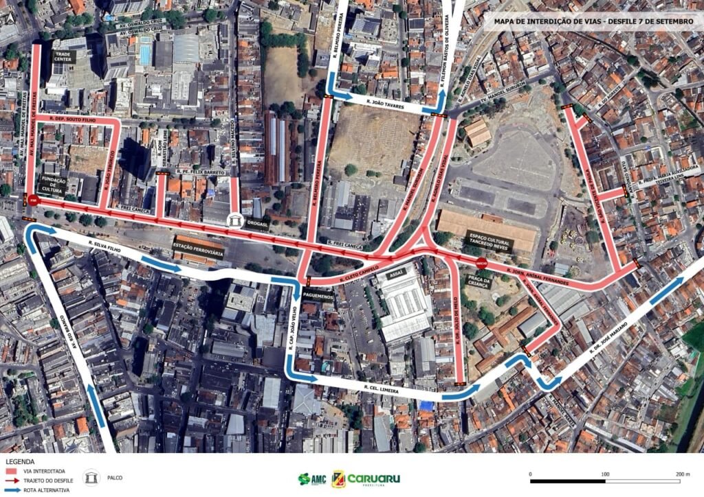 Para a realização do desfile, diversas ruas serão interditadas para que seja garantida a segurança e mobilidade do público no evento do feriado de 07 de Setembro. Desta forma, a Autarquia de Mobilidade de Caruaru (AMC), informou que, a partir das 6h deste domingo (7), ruas serão interditadas as ruas: São Vicente de Paula, Jornalista Aníbal Fernandes, Dr.Júlio de Melo, Agnelo Dias Vidal, Manoel Surubim, Cleto Campelo, Frei Caneca, Deputado Souto Filho e João Tiburcio, além de um trecho da rua Belmiro Pereira e a Avenida Manoel de Freitas.
