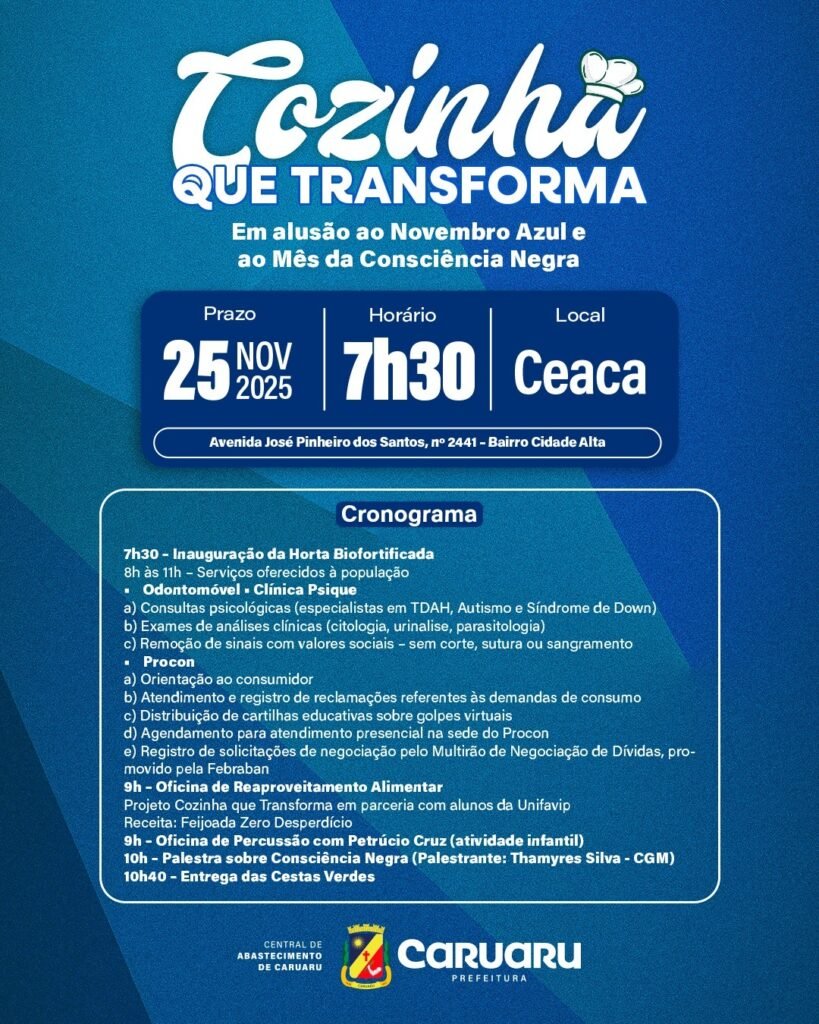 A Central de Abastecimento de Caruaru (Ceaca) realizará nesta terça-feira (25) uma edição do projeto Cozinha que Transforma com serviços gratuitos à população. A programação integra as campanhas Novembro Azul, de saúde masculina, e Mês da Consciência Negra.