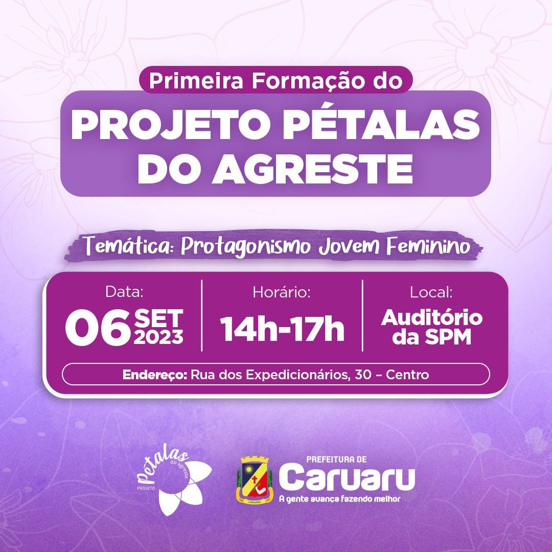 Será realizada, nesta quarta-feira (06), das 14h às 17h, a primeira formação do projeto Pétalas do Agreste promovido pela Prefeitura de Caruaru, por meio das secretarias de Educação e Esportes (Seduc), Saúde (SMS), Políticas para as Mulheres (SPM) e Desenvolvimento Social e Direitos Humanos (SDSDH). Com a temática “Protagonismo Jovem Feminino”, as 50 estudantes da Rede Municipal de Ensino selecionadas darão início ao sonho do Baile de Debutantes.