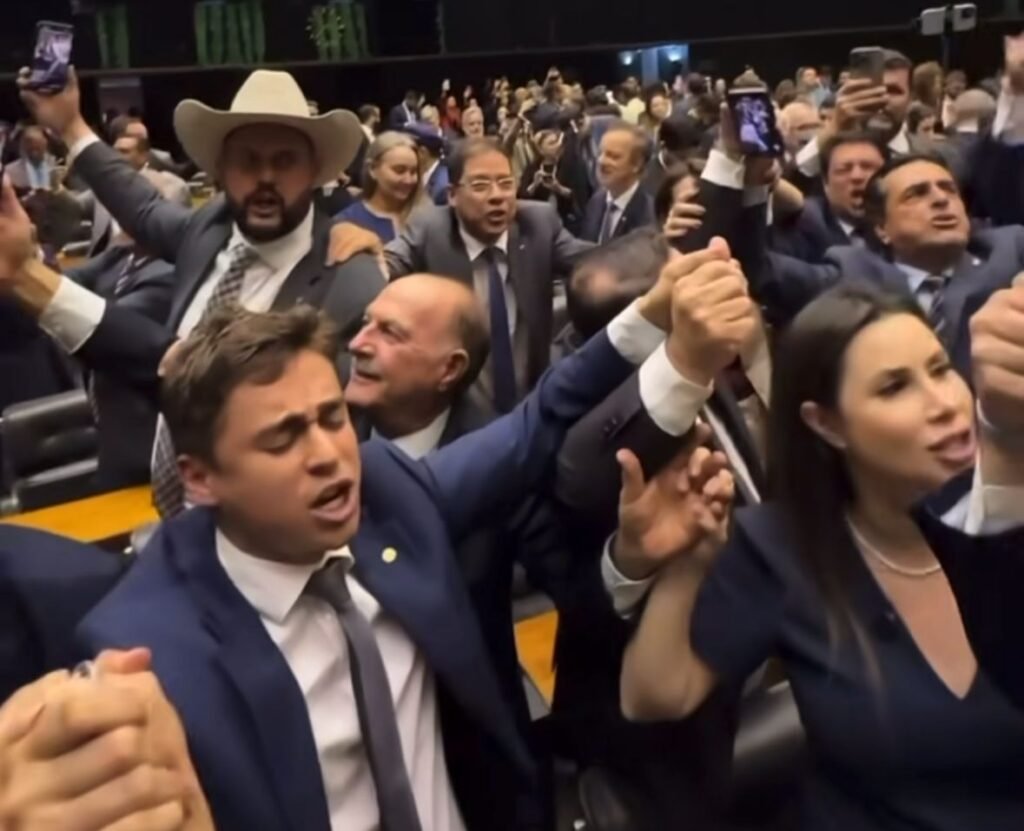 Deputados da bancada de oposição ao governo e aliados ao ex-presidente Jair Bolsonaro (PL), comemoram a aprovação do regime de urgência para análise do Projeto de Lei que concede a anistia (perdão) aos condenados pelos atos golpistas e contra o Estado. A votação aconteceu nesta quarta-feira (17) e foi aprovada a urgência com um total de 311 votos a favor. Outros 163 parlamentares votaram contra a proposta.