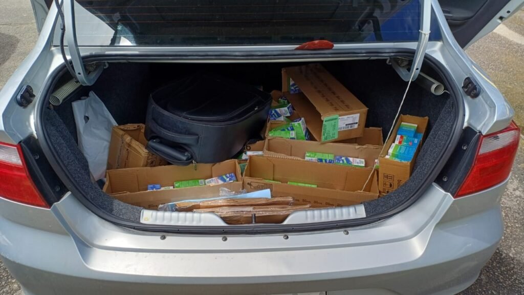 Policiais receberam informações de que o carro de uma farmacêutica havia sido roubado e realizaram buscas, até localizar o veículo suspeito próximo da BR 101. No porta-malas e no interior do veículo, foram recuperadas diversas caixas com medicamentos.