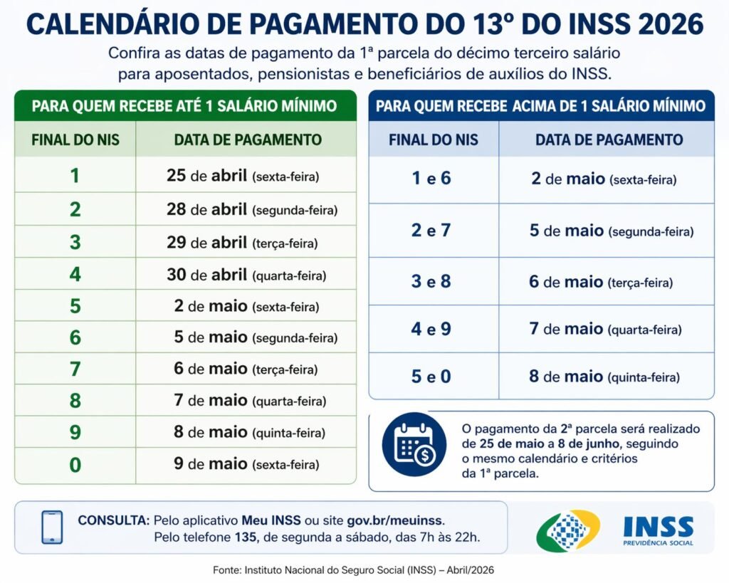 O pagamento será feito em duas parcelas. A primeira segue até o dia 8 de maio, enquanto a segunda está programada para ocorrer entre 25 de maio e 8 de junho. O calendário leva em consideração o dígito final do Número de Inscrição Social (NIS) e a faixa de renda, priorizando quem recebe até um salário mínimo.