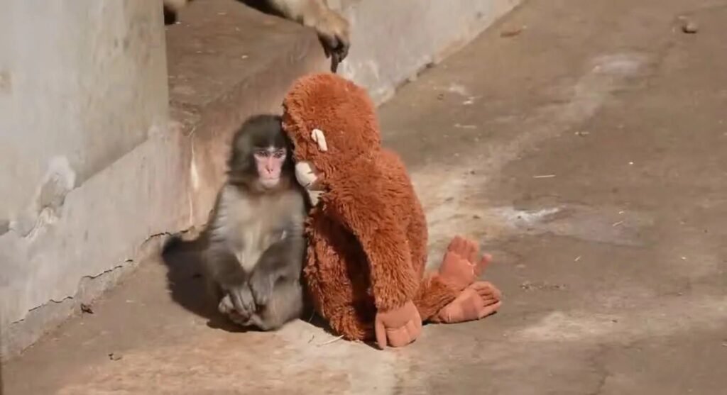 As imagens mostram o macaco carregando o orangotango de brinquedo junto ao corpo, comportamento que especialistas associam à busca por segurança em situações de ansiedade ou isolamento. A estratégia é comum em programas de manejo voltados a filhotes órfãos ou que apresentam dificuldades de socialização.
