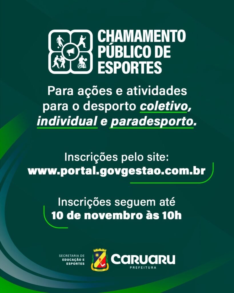 A Prefeitura de Caruaru, por meio da Secretaria de Educação e Esportes, abriu inscrições para o Chamamento Público de Esportes. A iniciativa tem como objetivo selecionar propostas que desenvolvam ações e atividades esportivas nas modalidades coletivas, individuais e paradesportivas em diversas comunidades do município.