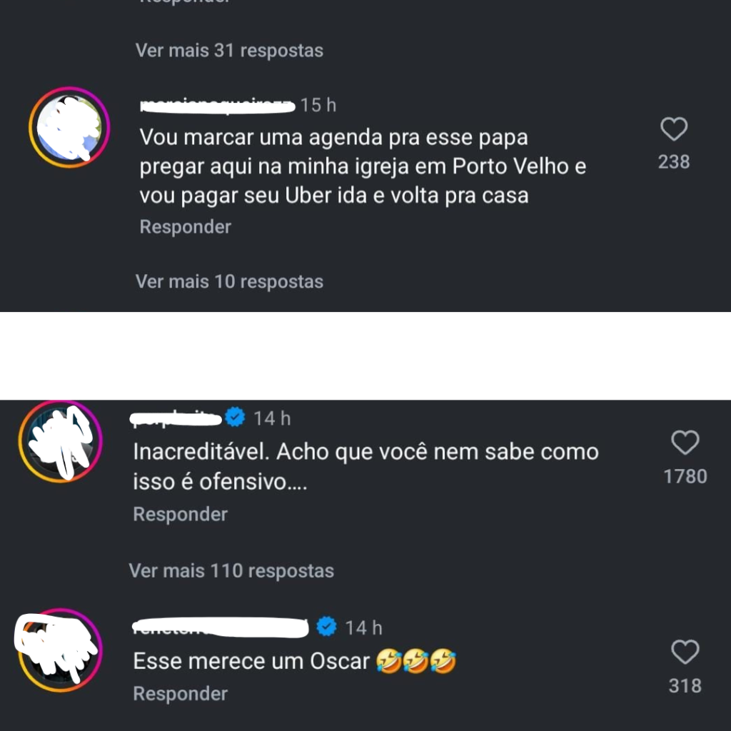 A foto, no entanto, não passa de uma imagem gerada por Inteligência Artificial. Entre os comentários as opiniões foram diversas como: “Que isso, o ANTI-CRISTO?”, “Inacreditável. Acho que você nem sabe como isso é ofensivo…” e “Vou marcar uma agenda pra esse papa pregar aqui na minha igreja em Porto Velho e vou pagar seu Uber de ida e volta pra casa”.