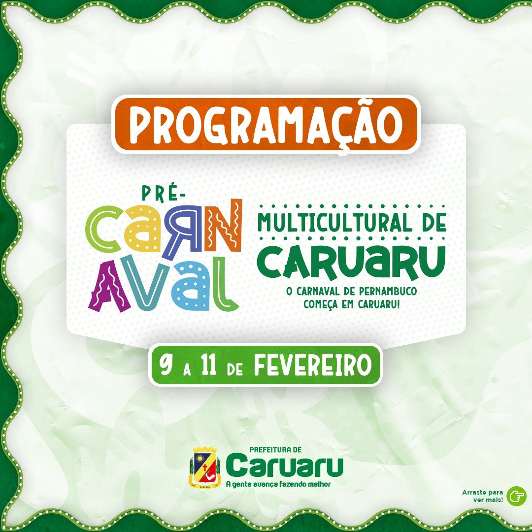 A Prefeitura de Caruaru, por meio da Fundação de Cultura, divulga a programação oficial do período pré-carnavalesco na cidade, que tem início na próxima quinta-feira (9) e segue até o sábado (11). Com seis polos de animação da folia, este ano, Caruaru terá um leque de multiculturalidade, com artistas a nível nacional, regional e local que apresentarão seus diversos ritmos e movimentos.