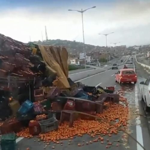 CAMINHÃO TOMBA COM CARGA DE TOMATE NA BR-104 EM CARUARU