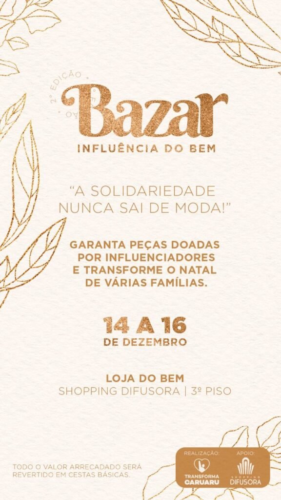 O bazar será realizado na Loja do Bem, localizada no terceiro andar do shopping Difusora e contará com peças novas e usadas das influencers Marcela Peixoto, Marcela Calado, doutora Carla Guedes, Ingryd Rabelo, Maria Camila Moraes, Thaisa Vila Nova, Juliana Nunes, Juliana Tavares, Joana Quariquasi e Juliana Florêncio.